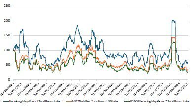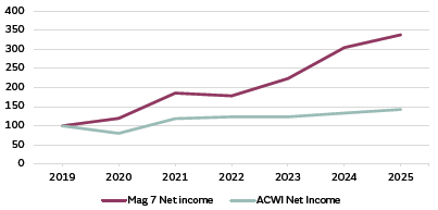 It is safe to assume that the love affair for US equities is not reflective of a macro perspective. Indeed, it is overwhelmingly driven by private investor appetite for a handful of securities. This appetite is personified by silly acronyms: the Magnificent Seven (Apple, Microsoft, Amazon, Alphabet, Tesla, Nvidia and Meta) or Batman (Broadcom, Alphabet, Apple, Tesla, Meta, Amazon and Nvidia). Both movies share the theme of violence to protect society, hardly a coherent way to construct an investment portfolio. But both the Magnificent Seven and Batman win in the end and the earnings performance of this tiny cohort does merit serious allocation attention.