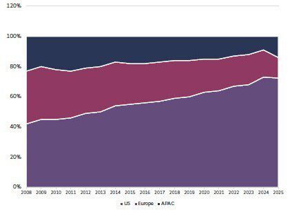 The effect of this dominant US equity performance over the past several years means that global investors have become increasingly concentrated in the US.